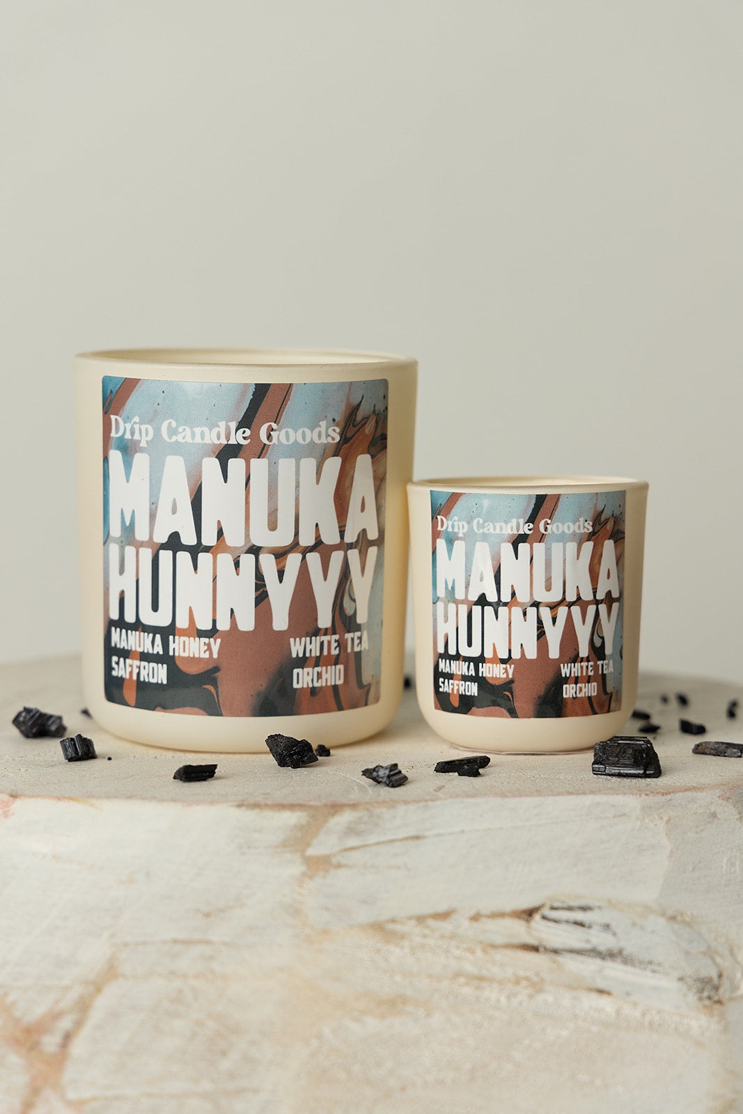 Treat yourself to golden hour glow with our Manuka Hunny Massage Candle. This luxurious candle melts into a warm body oil, infused with Manuka honey, white tea, fresh orchid, and saffron. Crafted with a 100% skin-safe wax blend, incorporating the finest ingredients for a truly indulgent experience. Our wax formula includes beeswax, soy, coconut, and RSPO palm oils, ensuring a clean and eco-friendly burn. It's the perfect blend of flirty relaxation.