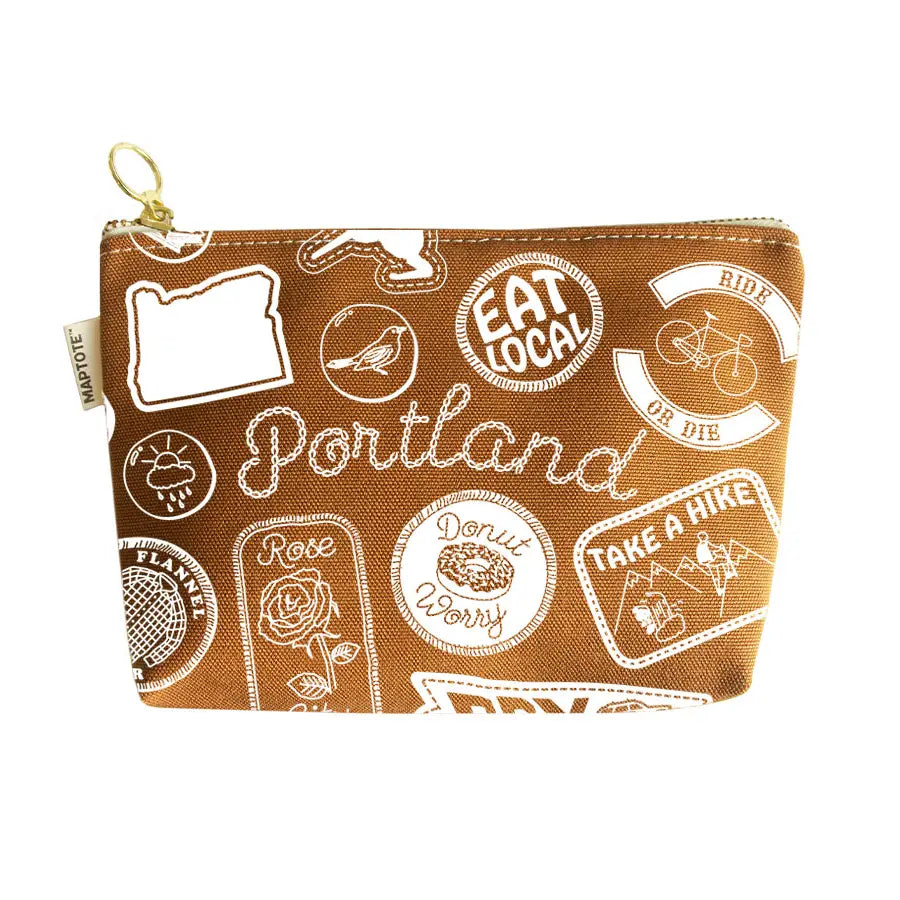 - Portland Travel Zip Pouch: Explore the charm of Portland with a whimsical design of patches and pins.