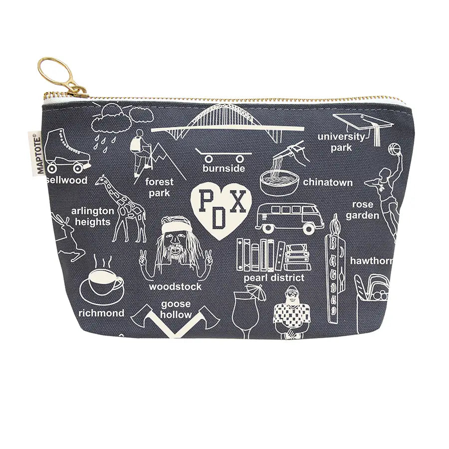 Elevate your everyday organization with the Portland Travel-Inspired Zip Pouch by Maptote – a whimsical fusion of patches and pins that tell the tale of the City of Roses. Crafted with care by the eco-friendly and woman-owned brand based in Brooklyn, NY, this pouch is more than just a stylish accessory; it's a portable piece of Portland charm.