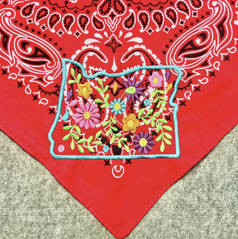 - Oregon Floral Bandana: Embrace Oregon pride with a stunning red bandana featuring floral embroidery.